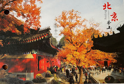 Hi, I'm Eva from Beijing China. This picture shows the Chinese temple with autumn view in Beijing. Fragrance Hill. The stamp at left side is the picture of Cloisonné product from Qing Dynasty. Hope you like it.